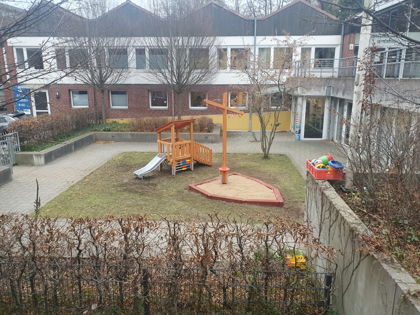 Der Turm wurde in Verbindung mit der Sandkiste in Schiffsoptik gebaut, sodass die Kinder in einem maritimen Ambiente spielen können.